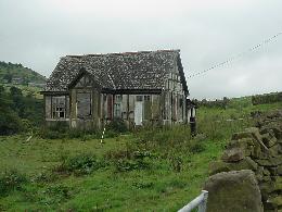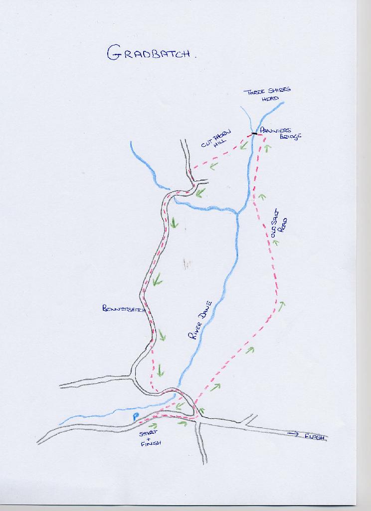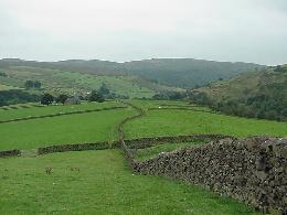 Follow the way marked path from the top end of the car park alongside the infant Dane to the tarmac road. Turn left, but not across the footbridge, and walk to the road junction beyond the farm. Go left again and before the road drops to a corner turn right through a gateway to pass to the right of a house. Go right over the stile by a footpath sign. go ahead to pass through a gateway then keep company with a dry stone wall on your left for several fields. In one of the early fields you will pass by a derelict building .