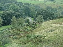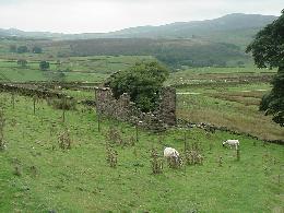 Cross it and walk diagonally left across the first enclosure, go through a gateway then follow the wall round towards a derelict building. Pass to the right of this building to climb a stile leading to an old drovers track just above.