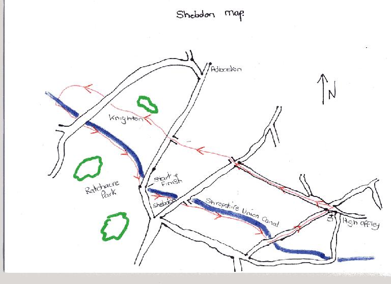 | Park near the Wharf inn, Shebdon. This is out of the village turn left and about � a mile you come to the pub. Walkup the ramp to the Shropshire Union Canal towpath and turn right. You will see the Shebdon Winding Hole immediatly on your left. Continue for about 1.5m until you come to the Anchor inn this is an award-winning pub. Go up on the bridge (no. 42) and turn right towards High Offley Church. After passing Pegs Farm on your right you can see High Offley Church. When you see a public footpath sign on your right with a very high stile go over and follow the power lines till you reach a rickety stile. Turn left along the road and then left again at the T-junction signposted to Shebdon. High Offley Church is now on your left, we sheltered here when we were caught in a wonderful downpour. Even if are not caught in the rain the Church Yard is well worth a look and there is a lovely seat to have a rest in the courtyard. Continue down the road and over a small stream and past a farm with a green barn roof set back from the road. When you come to the signpost for Shebdon continue forward to a public Bridleway with holly bushes both sides. When you reach the road turn left and immediately left along the footpath at Offley Grove Farm. Go through the gate. Here look to you left when we were here they had two pot bellied pigs in the field. Go through two more gates, then straight on along the edge of the field keeping the hedge to your right. You shortly see a small copse to the right. The Track bears left along the edge of the field and you see the twin towers of the Knighton Factory on your left. This factory was used to make milk products and they would then transport the goodies on the canal to various destinations. After going up and down a small rise turn right and cross over the footbridge. You emerge at a man-made fishery. Go to your right and climb up the hill keeping the house to your right pass by it and climb the stile to the road. At the road turn left and then right along a wide track. At the junction turn left and going over a bridge to rejoin the canal towpath. You will pass the back of the knighton Factory and as you pass the warf think about the horse drawn narrow boats that went as far as the Cadbury�s factory at Bournville. Walk for about 1.1m along the straight embankment section of the Canal to bring you back to the Wharf Inn at Shebdon.